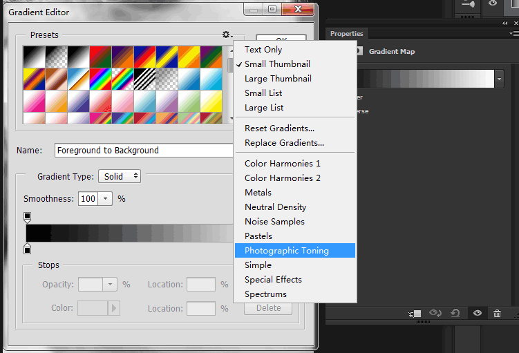 4、好了,开始为照片的色彩增加一点微妙的效果,我在这里选择增加“渐变映射”调整图层,在调整图层的属性面板中,对渐变色调进行选择,在这里打开预设里的“照片色调”,如果之前没有就进行追加。这时,选择其中一个渐变色调“铜褐色”。然后将调整图层模式变为“叠加”,透明度降低为30.